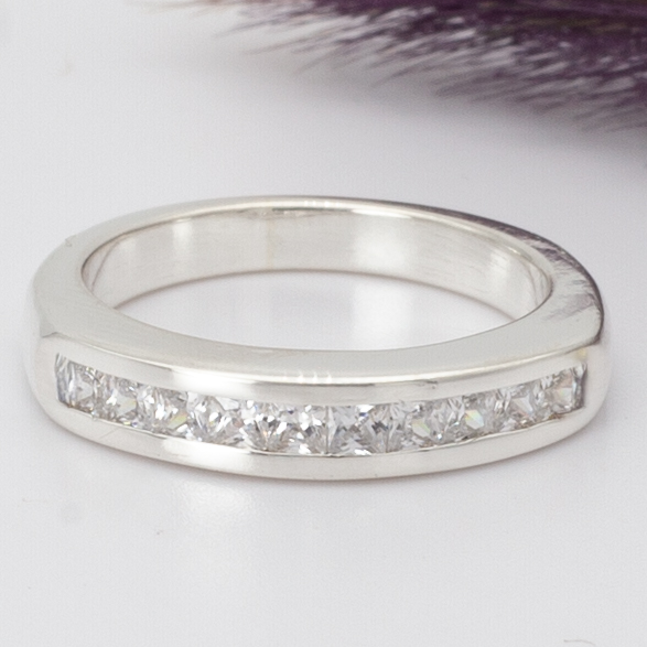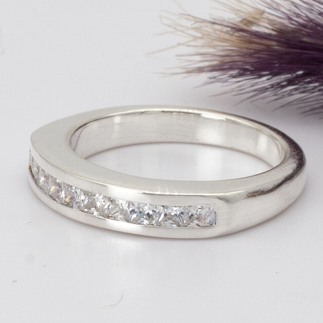 Este anillo Chanell Set Princess, en plata 925 maciza, está hecho a mano cuidando cada detalle del diseño para resaltar las circonias en corte princesa y su delicada disposición.